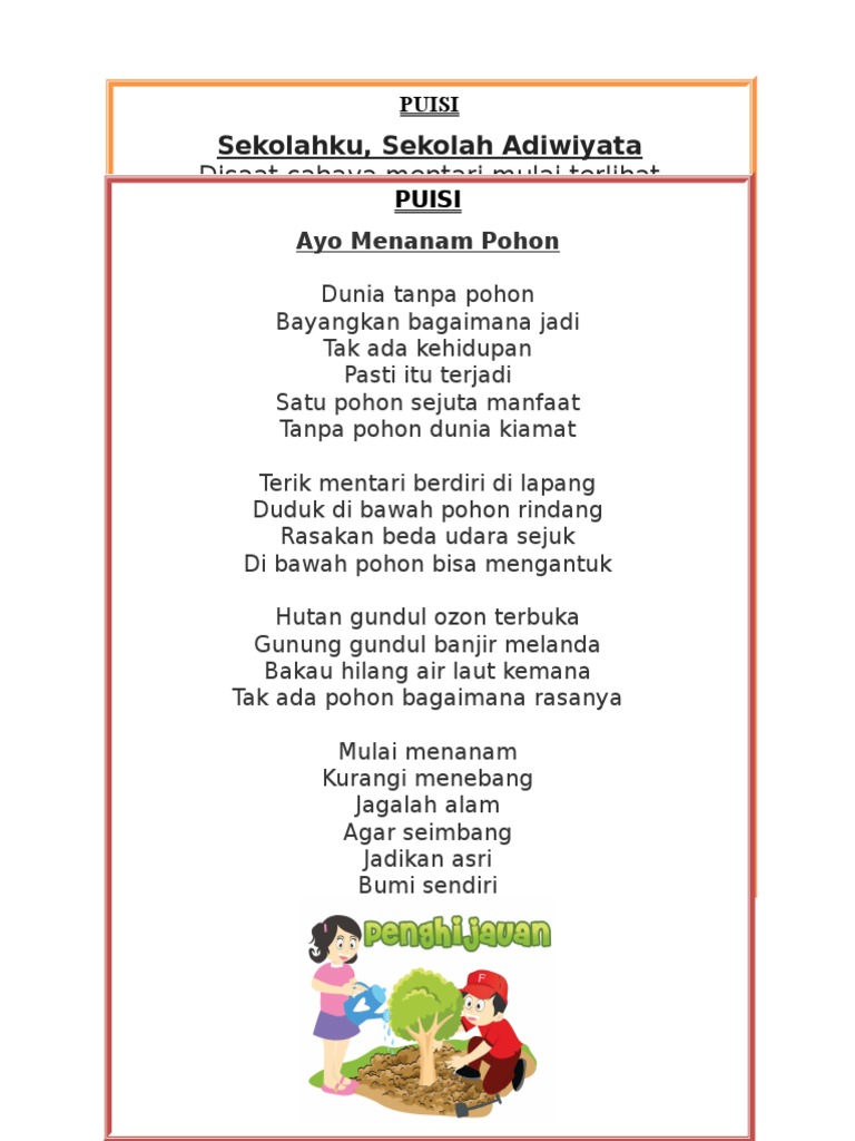Bagi orang orang yang gemar berkata kata lewat tulisan alam pun bisa dijadikan puisi. Bagaimana tidak indonesia yang terkenal juga dengan sebutan zamrud katulistiwa merupakan negeri dengan sumber daya alam melimpah serta dianugerahi pula pemandangan alam yang indah dan menawan. Puisi alam puisi adalah sebuah karya sastra yang berbentuk tulisan. Dalam penyusuunannya puisi ini menceritakan tentang banyak hal berkaitan dengan kondisi lingkungan terlebih dengan banyaknya kejadian kejadian yang menyedihkan seperti kebakaran hutan illegal loging atau penebangan liar sehingga membuat kondisi alam tidak lagi teratur serta. Sehingga dalam menentukan tema puisi anak itu berkisar di antara kehidupannya sebagai anak kecil. Contoh puisi tentang keindahan alam hidup di negeri ini sepertinya merupakan anugerah bagi kita semua ya sob. Ciptaan tuhan yang maha esa patut kita syukuri karena dengan segala keindahan dapat kita rasakan dalam kehidupan sehari hari. Baik itu ketakjuban dengan alam itu sendiri maupun kengerian saat alam sedang marah. Contoh puisi anak kelas 2 sd tentang lingkungan. Di indonesia yang terkenal dengan tanah syurga terdapat 996 juta hektar perhutanan atau sekitar 535 dari seluruh total wilayah indonesia.