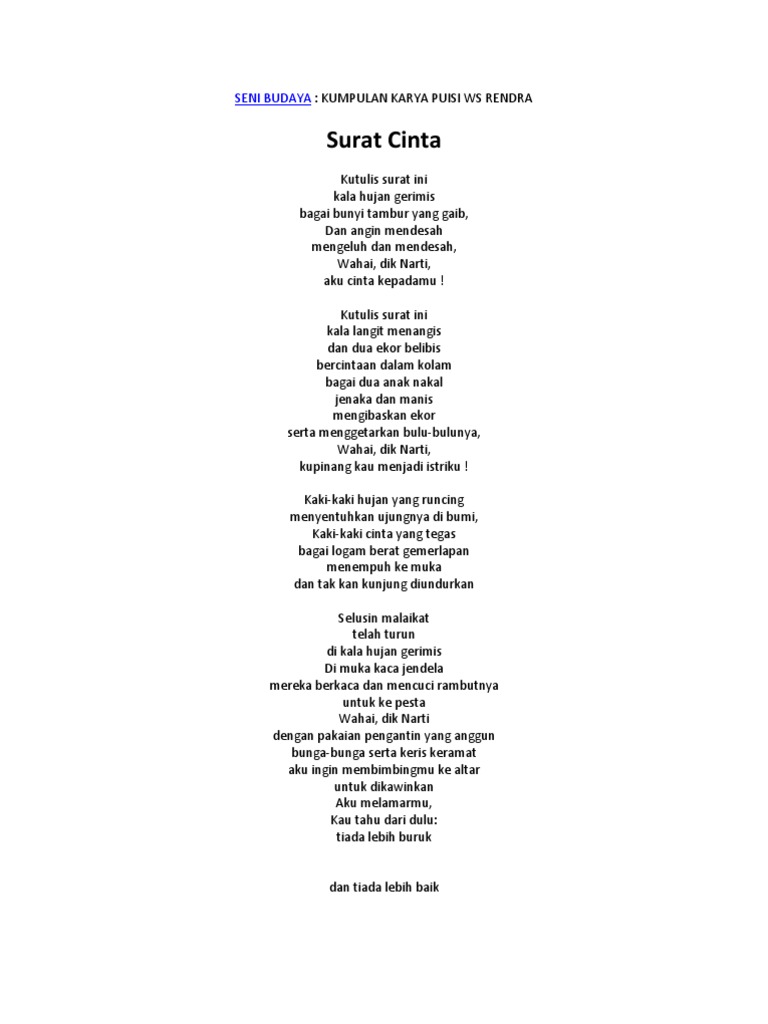 Contoh puisi ws rendra. Dimana hasil karyanya hingga kini menginspirasi pecinta sastra. Sambil berdiri di ambang pintu kereta api tergencet oleh penumpang berjubel dari yogya ke jakarta. Karena dalam puisinya terpampang jelas potret kelam negara tercinta kita indonesia. Ws rendra dan contoh puisinya rendra merupakan sastrawan yang terkenal dengan sebutan si burung merak. Sejarah akan mencatat rangkaian kata dalam puisi ws rendra sampai akhir zaman. Cyprianus sugeng brotoatmodjo dan raden ayu catharina ismadillahayahnya adalah seorang guru bahasa indonesia dan bahasa jawa pada sekolah katolik di solo disamping sebagai. Tuhan aku cinta padamu. Ia merangkak di atas bumi yang dicintainya tiada kuasa lagi menegak telah ia lepaskan dengan gemilang. Penulis yang dijuluki burung merak ini mulai memperlihatkan. Lane hemings january 21 2020 at 1051 pm.